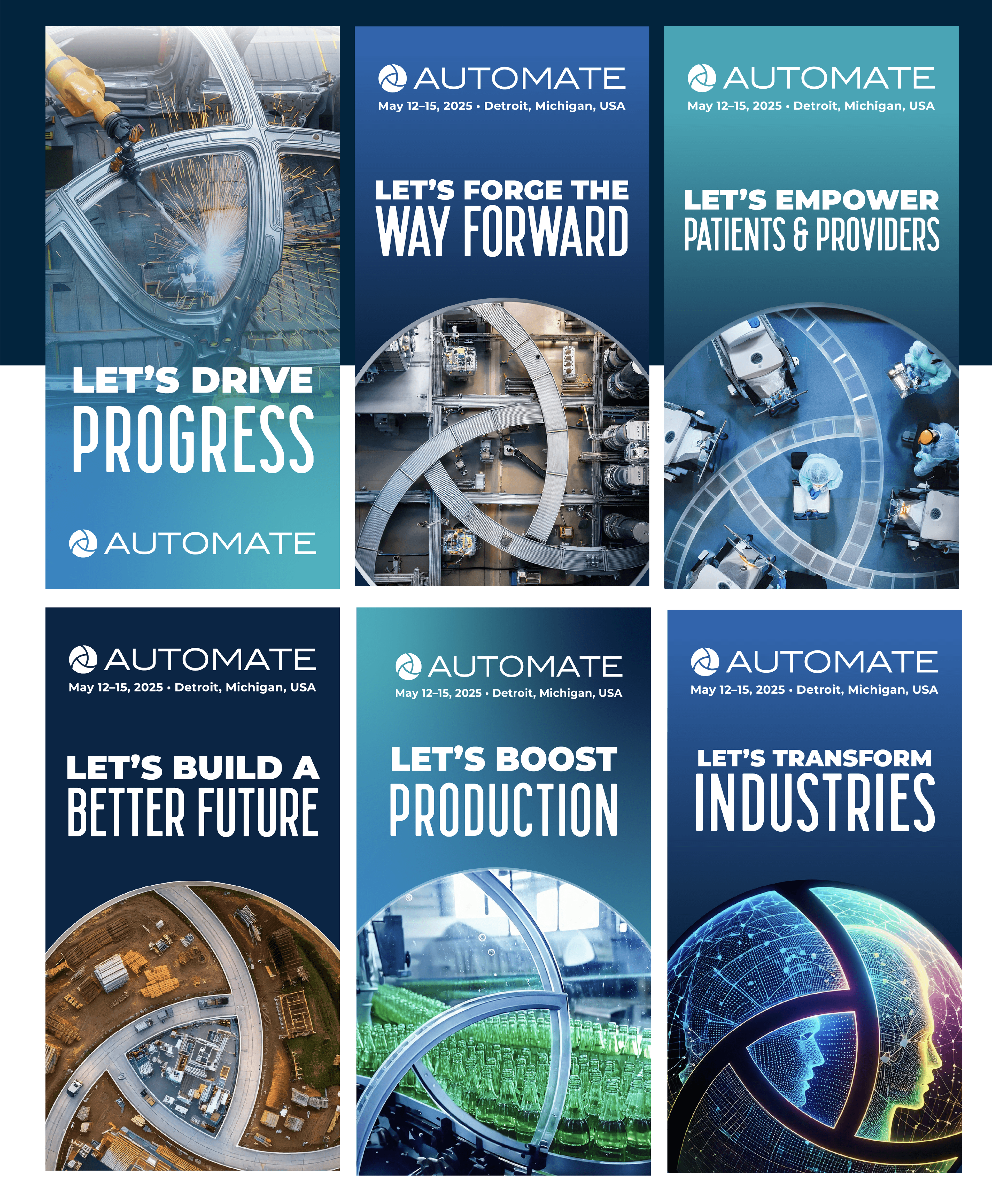As part of concepting Automate Show's 2025 brand evolution, we created an industry-first approach. This approach used custom created (with the help of AI generation) "globes" in the style of Automate's logomark. Each globe featured different solutions designed to speak to an industry-specific audience.